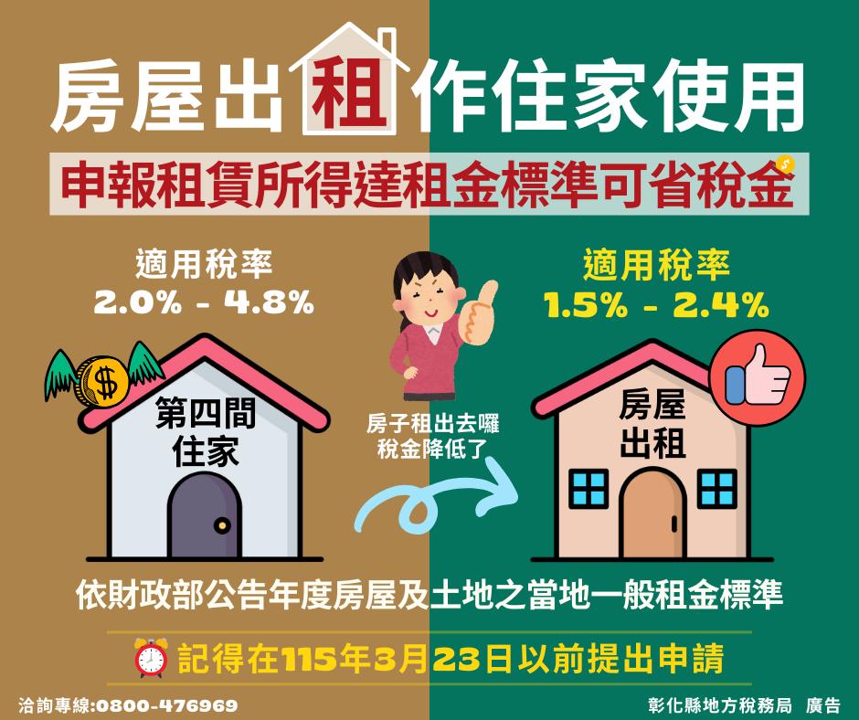 ::: 首頁 › 訊息專區 › 最新消息 最新消息 房屋稅優惠稅率 2026-02-24 租房屋供住家使用且申報租賃所得達租金 標準,可申請適用房屋稅優惠稅率,於115年3月23日前 提出申請,當期即適用。 回列表