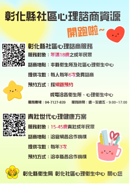 彰化縣社區心理衛生中心115年社區心理諮商服務已陸續開放預約囉!