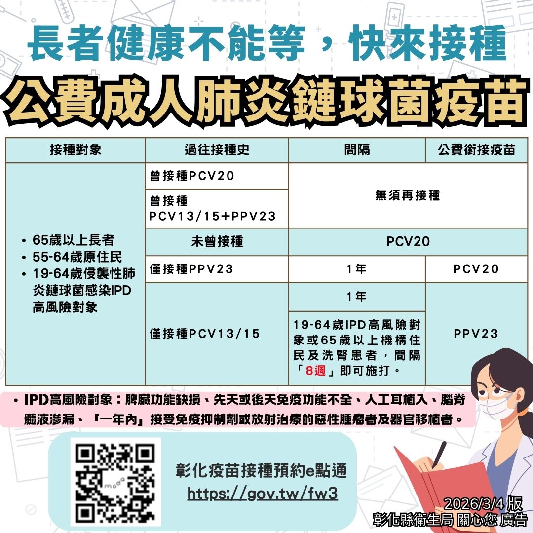 【長者健康不能等,快來接種公費成人肺炎鏈球菌疫苗!】